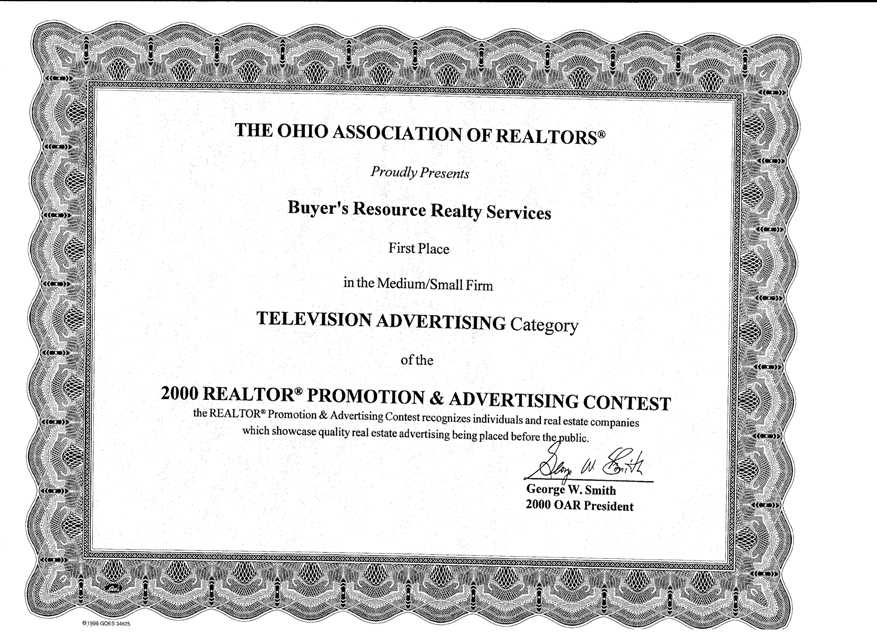 In 2000, we won FIRST PLACE in the television advertising category for a medium/small real estate firm in the State of Ohio. The advertising & promotion contest was